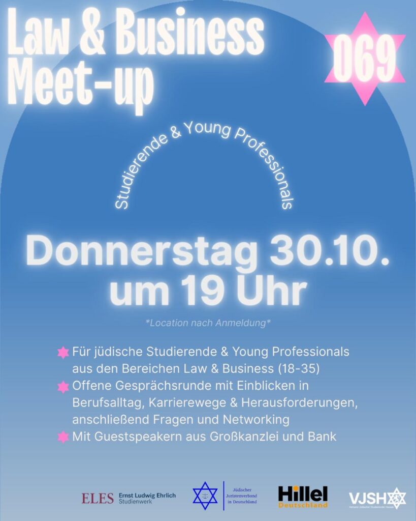 Der Jüdische Juristenverband in Deutschland lädt gemeinsam mit dem VJSH, ELES und Hillel Deutschland zum Law & Business Meet-up am 30. Oktober 2025 um 19:00 Uhr in Frankfurt am Main ein. Der Abend richtet sich an Studierende und Young Professionals aus den Bereichen Recht und Wirtschaft und bringt sie mit jüdischen Persönlichkeiten aus Investmentbanking und Kanzlei ins Gespräch.