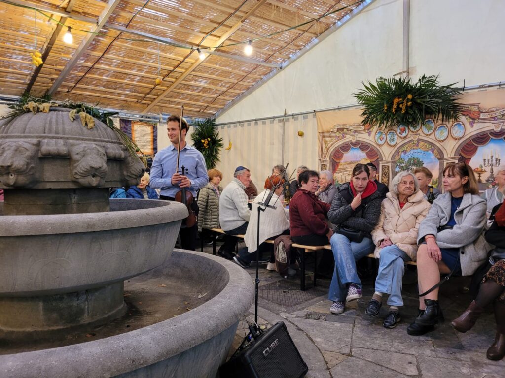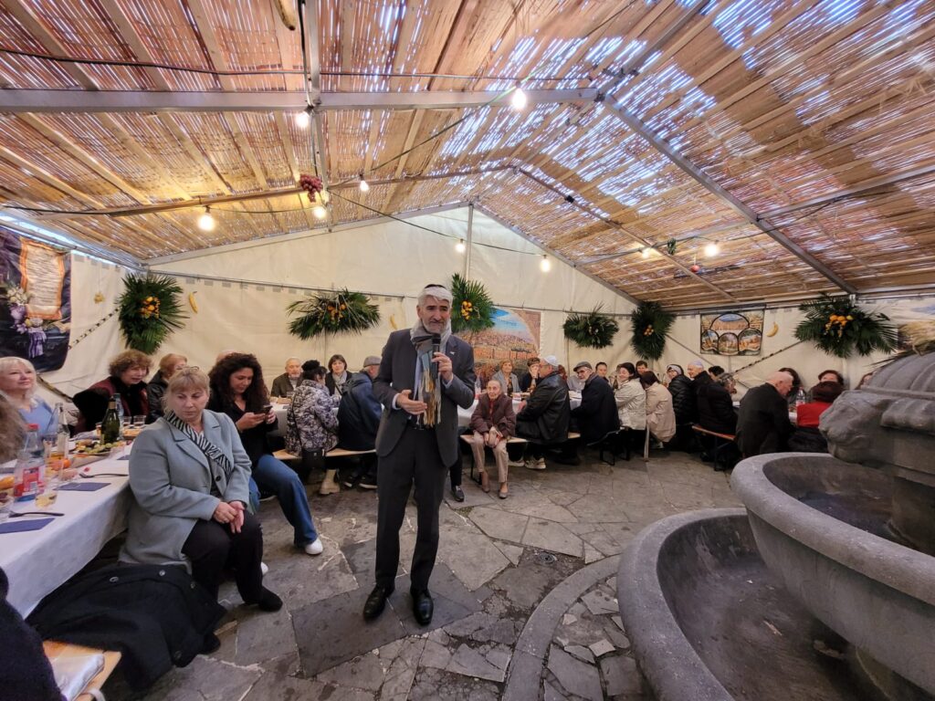 Die diesjährige Sukkot-Feier für die Generation 60+, organisiert vom Gemeindeclub Naches, in Kooperation mit dem Rabbinat, war ein besonderes Erlebnis voller Wärme, Musik und Gemeinschaft. Über 120 Teilnehmerinnen und Teilnehmer kamen am 12.10.2025 in die Sukka der Westend-Synagoge zusammen, um gemeinsam das Laubhüttenfest zu feiern. Rabbiner Julian-Chaim Soussan führte mit seinen Erklärungen und Gedanken auf eindrucksvolle Weise durch die religiöse und symbolische Bedeutung des Festes und schuf eine Atmosphäre der Besinnung und Freude. Musikalisch wurde die Feier von Oleksandr Darmits begleitet, dessen einfühlsame Darbietungen dem Nachmittag eine festliche und inspirierende Stimmung verleiht hat.