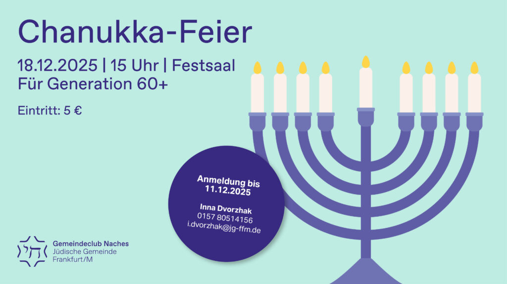 Am 18. Dezember 2025 lädt der Gemeindeclub Naches alle ab 60 Jahren um 15:00 Uhr zur Chanukka-Feier in den Festsaal unseres Ignatz Bubis-Gemeindezentrums (Savignystraße 66, 60325) ein. Gemeinsam werden die Kerzen entzündet, besondere Momente geteilt und das Fest der Lichter in stimmungsvoller Atmosphäre gefeiert. Für kulinarische Genüsse und gute Gespräche ist gesorgt – ein warmherziger Treffpunkt mitten im Winter.