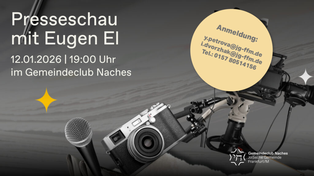 Erste Presseschau mit Eugen El im neuen Jahr: Wir laden Sie herzlich zur ersten Presseschau mit Eugen El im neuen Jahr am 12. Januar 2026 um 19:00 Uhr im Gemeindeclub Naches (Savignystraße 66, 60325 Frankfurt am Main) ein. Gemeinsam blicken wir auf aktuelle Ereignisse, Hintergründe und Themen, die die Welt bewegen – und diskutieren diese in lebendiger Runde. Als besonderer Gast ist Alexander Jürgs von der Frankfurter Allgemeinen Zeitung (F.A.Z.) mit dabei. Seit vielen Jahren schreibt er Reportagen und Beiträge über jüdisches Leben in der Rhein-Main-Region und bringt seine journalistische Perspektive in die Diskussion ein.