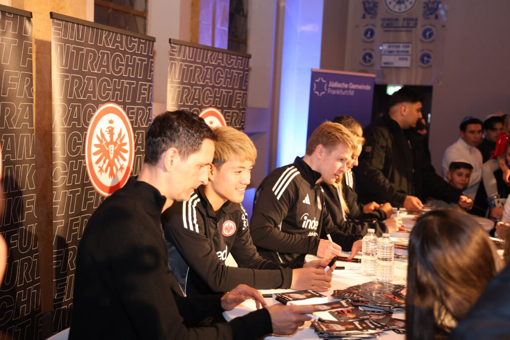 Gemeinsam mit der Spielerin Amanda Ilestedt, den Spielern Ritsu Doan, Jonathan Burkardt und Timothy Chandler sowie mit dem Trainer Dino Toppmöller von Eintracht Frankfurt erlebten wir einen unvergesslichen Abend. Zahlreiche kleine und große Fans kamen, machten Fotos, sammelten Autogramme auf Kippot, Schals, Trikots und Fußbällen – die Begeisterung war riesig! Die Stars der Eintracht haben sich Zeit für alle Fans genommen.