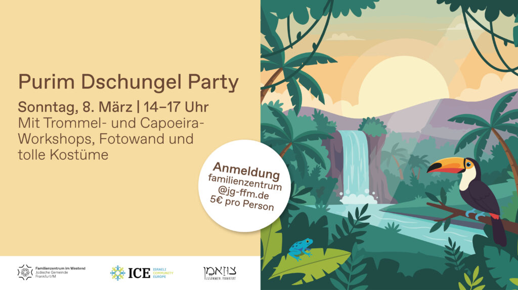 Der Dschungel ruft! Am 8. März 2026, feiern wir von 14:00 bis 17:00 Uhr unsere Purim Dschungel Party im Familienzentrum im Westend in Kooperation mit Zusammen Frankfurt. Dich erwartet ein bunter Nachmittag mit Bewegung, Musik und ganz viel Purim-Stimmung.