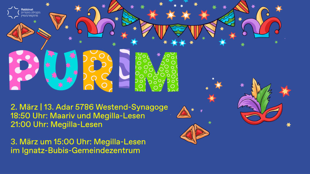 - Das Megilla- Lesen findet am 2. März um 21:00 Uhr in der Westend-Synagoge sowie am 3. März um 15:00 Uhr im Ignatz Bubis-Gemeindezentrum statt.