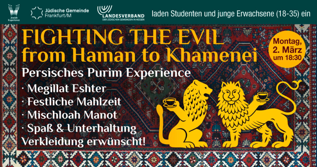 Am 2. März 2026, treffen sich Studierende und junge Erwachsene zwischen 18 und 35 Jahren zu einer „Persischen Purim Experience“ in Frankfurt am Main. Auf dem Programm stehen die Lesung der Megillat Esther, eine festliche Mahlzeit und Mischloach Manot – begleitet von Unterhaltung, Musik und ausgelassener Stimmung.