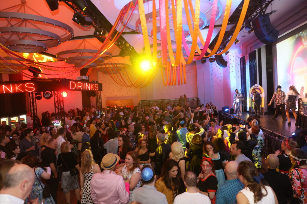 Vor dem Festsaal entstand ein Tel-Aviv-Moment inspiriert vom Gordon Beach dank einer Aufnahme des Fotografen Daniel Woeller, drinnen wartete eine 60er-Zeitkapsel mit Petticoats, Hawaiihemden und sogar einem Flipper sowie Fotobooth.