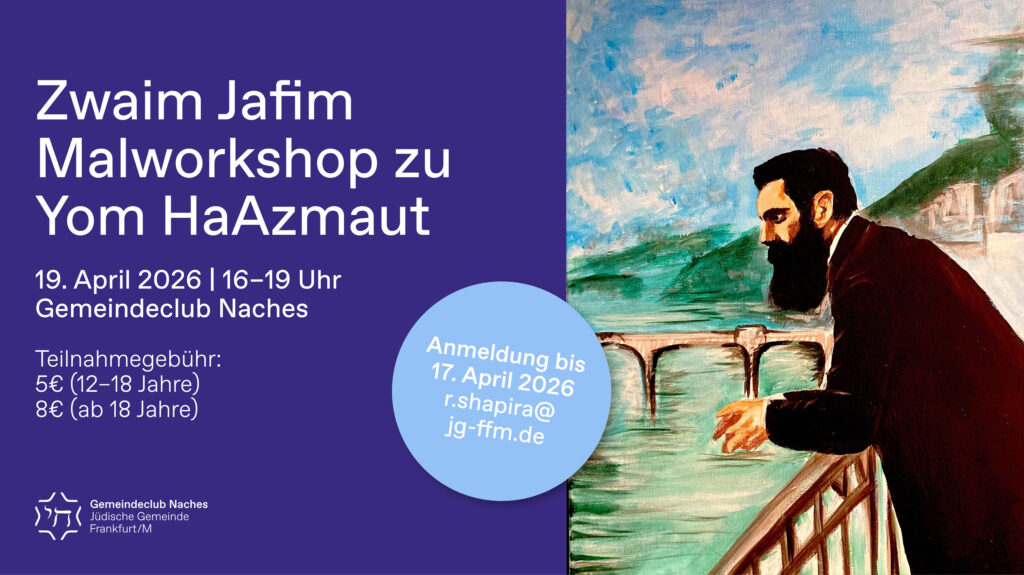 Der Gemeindeclub Naches (Savignystraße 66, 60325 Frankfurt) lädt am Sonntag, 19. April 2026 von 16:00–19:00 Uhr anlässlich von Yom Ha’atzmaut zum generationsübergreifenden Malworkshop „Zwaim Jafim“ ein. Im Mittelpunkt steht das ikonische Motiv von Theodor Herzl auf dem Balkon in Basel – verbunden mit seinem berühmten Satz: „אם תרצו אין זו אגדה“ – „Wenn ihr wollt, ist es kein Traum“, der bis heute als Ausdruck zionistischer Hoffnung und Vision gilt.