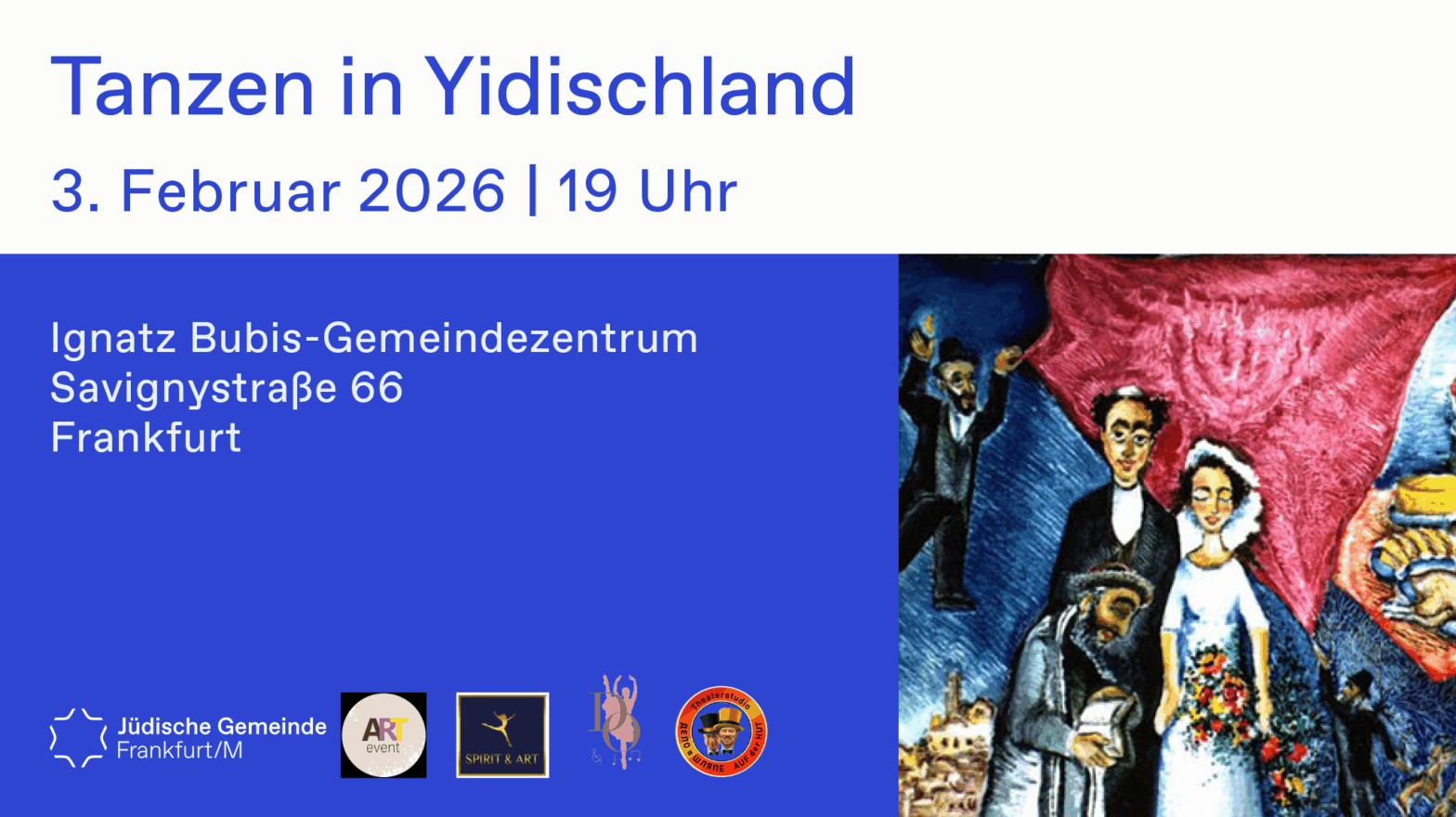 Tanzen in Yidischland Am 3. Februar 2026 findet im Ignatz Bubis-Gemeindezentrum (Savignystraße 66, 60325 Frankfurt am Main) die Gesangs- und Tanzshow „TANZEN in YIDISCHLAND“ statt. Das Konzert beginnt um 19:00 Uhr (Einlass: 18:30). Das Konzertprogramm umfasst jiddische Lieder, dargeboten von jungen und erwachsenen Talenten und ergänzt durch ausdrucksstarke Tanzelemente. Interaktive Programmpunkte laden das Publikum zum… Community Events weiterlesen