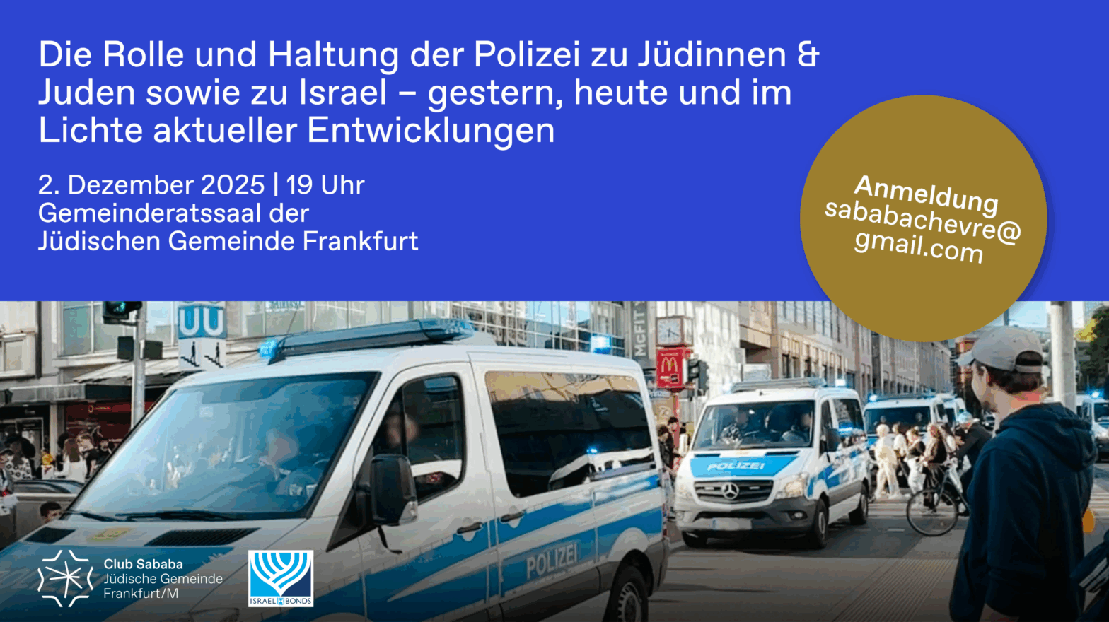 Wie steht die Polizei zu Jüdinnen & Juden und zu Israel? Wie haben sich Haltung und Realität im Dienst in den letzten 30 Jahren verändert – besonders seit dem 7. Oktober 2023? Darüber spricht Olli Kos, Polizist in Frankfurt und bekennender Israelfreund, am 2. Dezember 2025, um 19:00 Uhr im Gemeinderatssaal der Jüdischen Gemeinde Frankfurt… Club Sababa: Die Rolle und Haltung der Polizei zu Jüdinnen & Juden sowie zu Israel weiterlesen