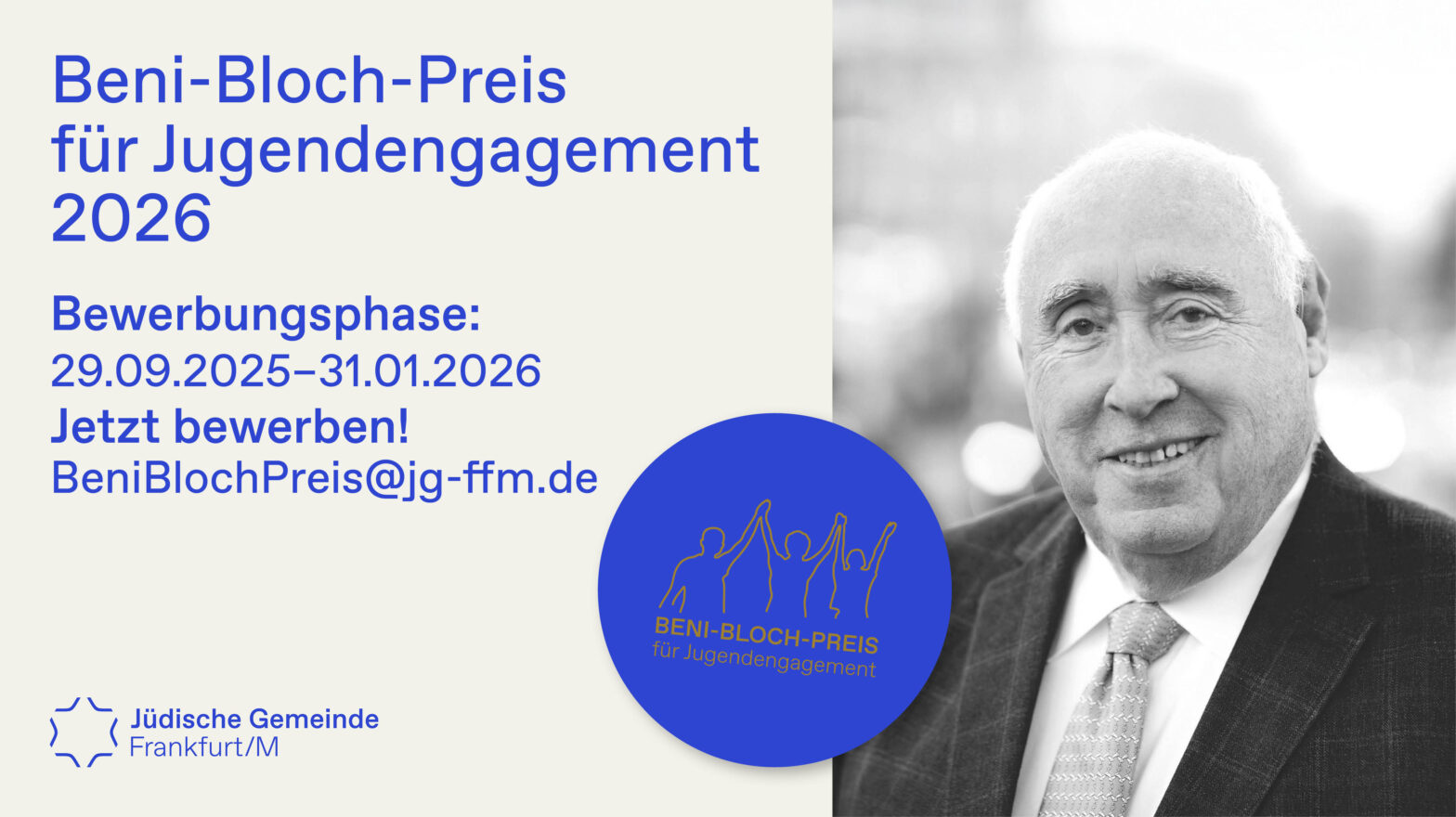 ÜBER DEN BENI-BLOCH-PREIS Der Beni-Bloch-Preis für Jugendengagement zeichnet Projekte und Initiativen für Jugendliche aus, die sich für ein friedvolles und tolerantes Miteinander einsetzen. THEMEN Vorzugsweise mit Bezug zum jüdischen Leben in Frankfurt am Main oder Hessen, z.B.: Deutsch-Jüdische Geschichte, Verständigung und Gedenken, Soziales und/oder generationsübergreifendes Engagement, Integration, Inklusion und Teilhabe, Engagement gegen Antisemitismus oder Rassismus.… Beni-Bloch-Preis für Jugendengagement 2026 weiterlesen