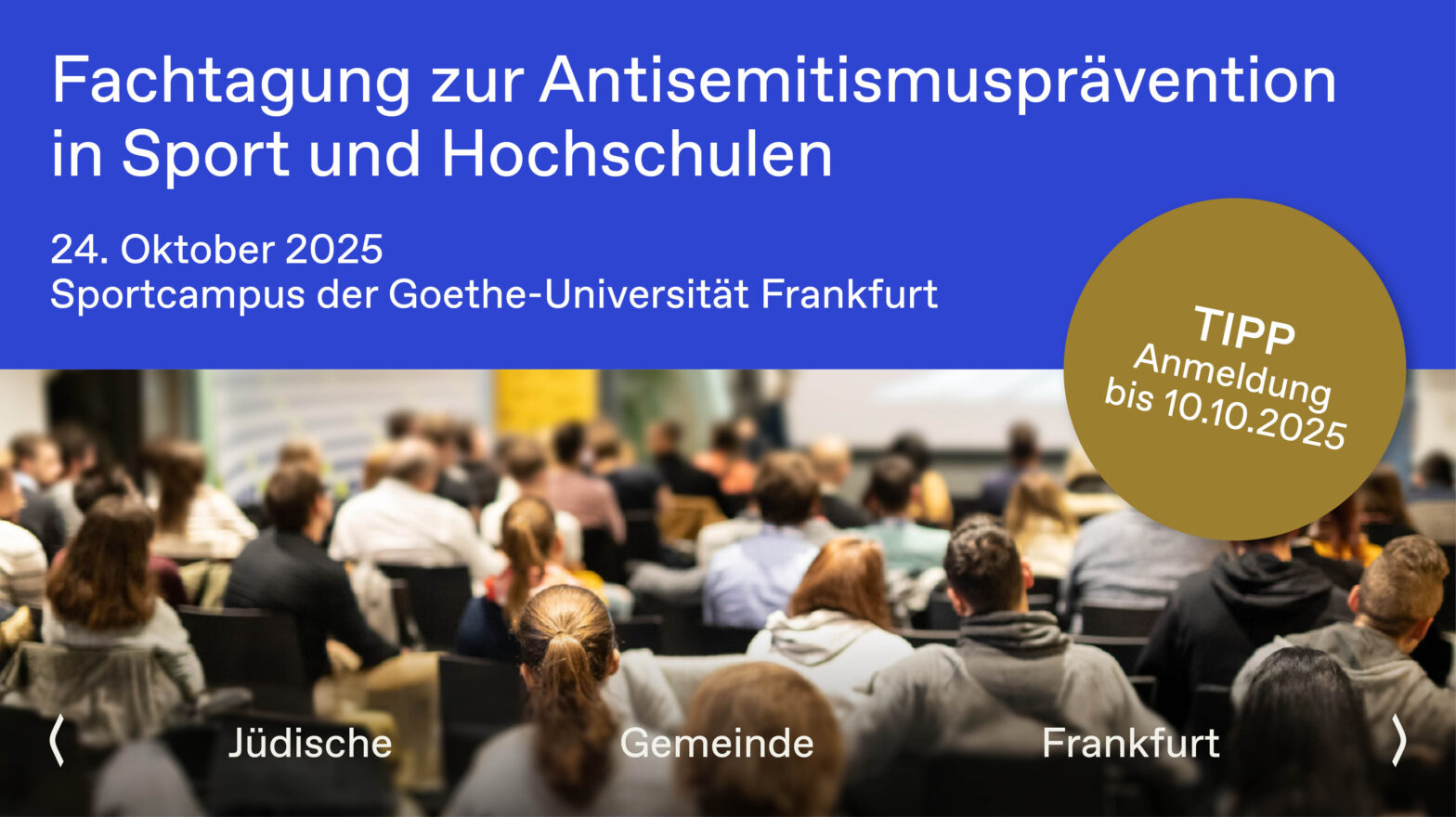 Fachtagung: Vom Sport lernen? Antisemitismusprävention in der Universität. Am 24. Oktober 2025 von 12:00–17:00 Uhr lädt das Institut für Sportwissenschaften der Goethe-Universität Frankfurt herzlich ein, gemeinsam zu diskutieren: Welche Erfahrungen aus der Prävention im Sport können Hochschulen nutzen? Wie gelingt zielgerichtetes Handeln gegen Antisemitismus in Wissenschaft und Bildung? Die Tagung richtet sich an Forschende, Lehrende,… Fachtagung zur Antisemitismusprävention in Sport und Hochschulen weiterlesen