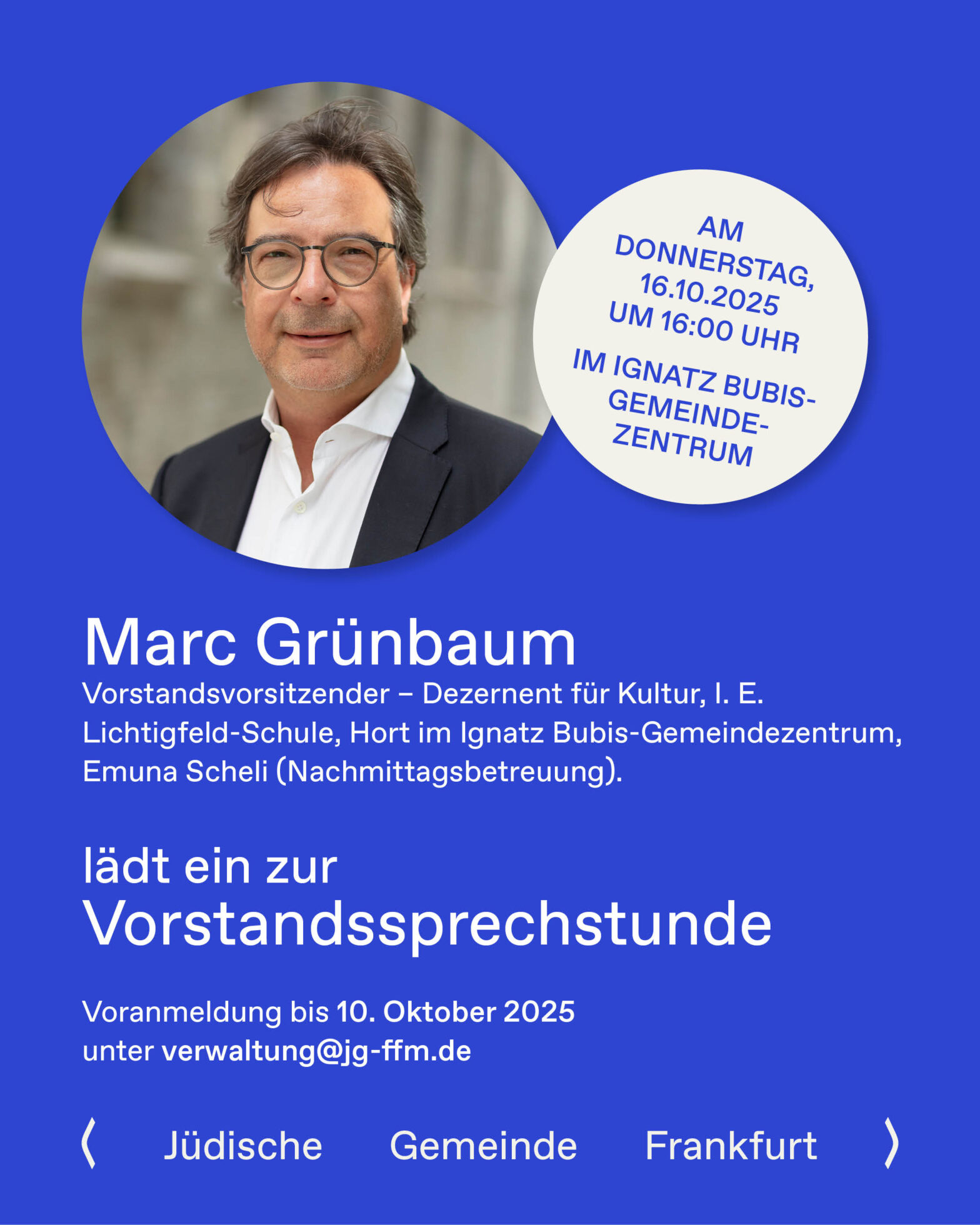 Kommen Sie mit uns ins Gespräch: Marc Grünbaum, Vorstandsvorsitzender und Dezernent für Kultur, I. E. Lichtigfeld-Schule, Hort im Ignatz Bubis-Gemeindezentrum, Emuna Scheli (Nachmittagsbetreeung) lädt zur Vorstandssprechstunde ein.