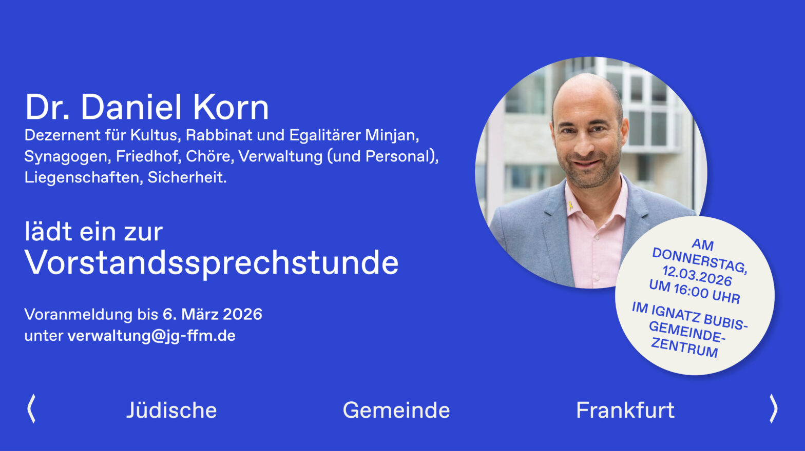 Die Jüdische Gemeinde Frankfurt lädt zur Vorstandssprechstunde ein: Am Donnerstag, den 12. März 2026, um 16:00 Uhr haben Gemeindemitglieder die Möglichkeit zum persönlichen Austausch mit Dr. Daniel Korn im Ignatz Bubis-Gemeindezentrum. In offener Atmosphäre können Anliegen, Fragen und Anregungen direkt besprochen werden. Eine Voranmeldung ist bis zum 6. März 2026 erforderlich unterverwaltung@jg-ffm.de