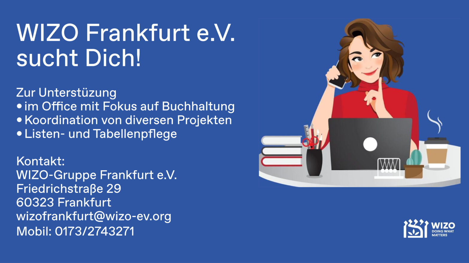 WIZO Frankfurt e.V. sucht Sie: Zur Unterstützung im Office mit Schwerpunkt Buchhaltung, Projektkoordination sowie Listen- und Tabellenpflege wird engagierte Verstärkung gesucht. Wer strukturiert arbeitet, gerne Verantwortung übernimmt und sich in einem sinnstiftenden Umfeld einbringen möchte, ist hier genau richtig. Arbeitsort ist Frankfurt am Main. Kontakt:WIZO-Gruppe Frankfurt e.V.Friedrichstraße 2960323 Frankfurtwizofrankfurt@wizo-ev.orgMobil: 0173 / 2743271