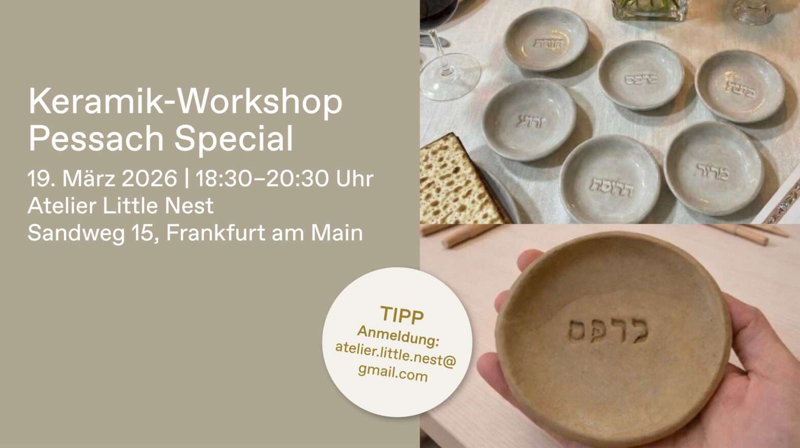 Tipp zu Pessach – Keramik-Workshop „Pessach Special“: Am 19. März 2026 von 18:30–20:30 Uhr lädt das Atelier Little Nest (Sandweg 15, 60316 Frankfurt) zu einem besonderen Keramik-Workshop ein. Gestaltet euer eigenes, einzigartiges Seder-Schalen-Set aus Ton und schafft ein persönliches Stück für den Sederabend.