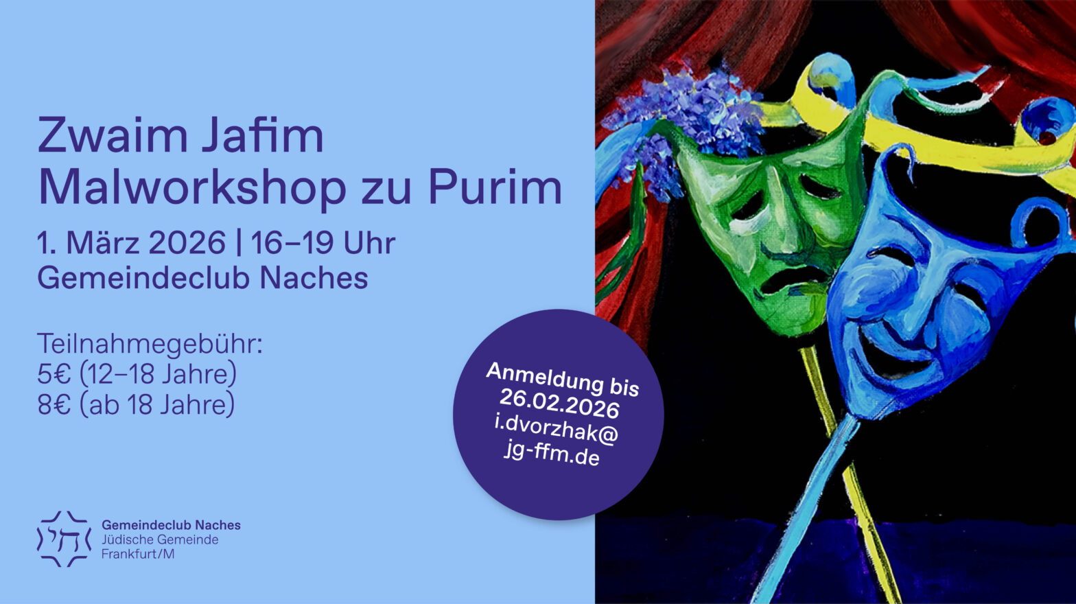 Zwaim Jafim Malworkshop zu Purim Zu Purim widmen wir uns beim Malworkshop „Zwaim Jafim“ dem Thema Maskenball: Sie sind herzlich eingeladen am 1. März 2026 von 16:00 bis 19:00 Uhr ganz ohne Vorkenntnisse, dafür mit Farbe, Fantasie und viel Freude im Gemeindeclub Naches bei unserem generationsübergreifenden Workshop zu Purim kreativ zu begehen. Frauentag im Gemeindeclub… Gemeindeclub im März weiterlesen